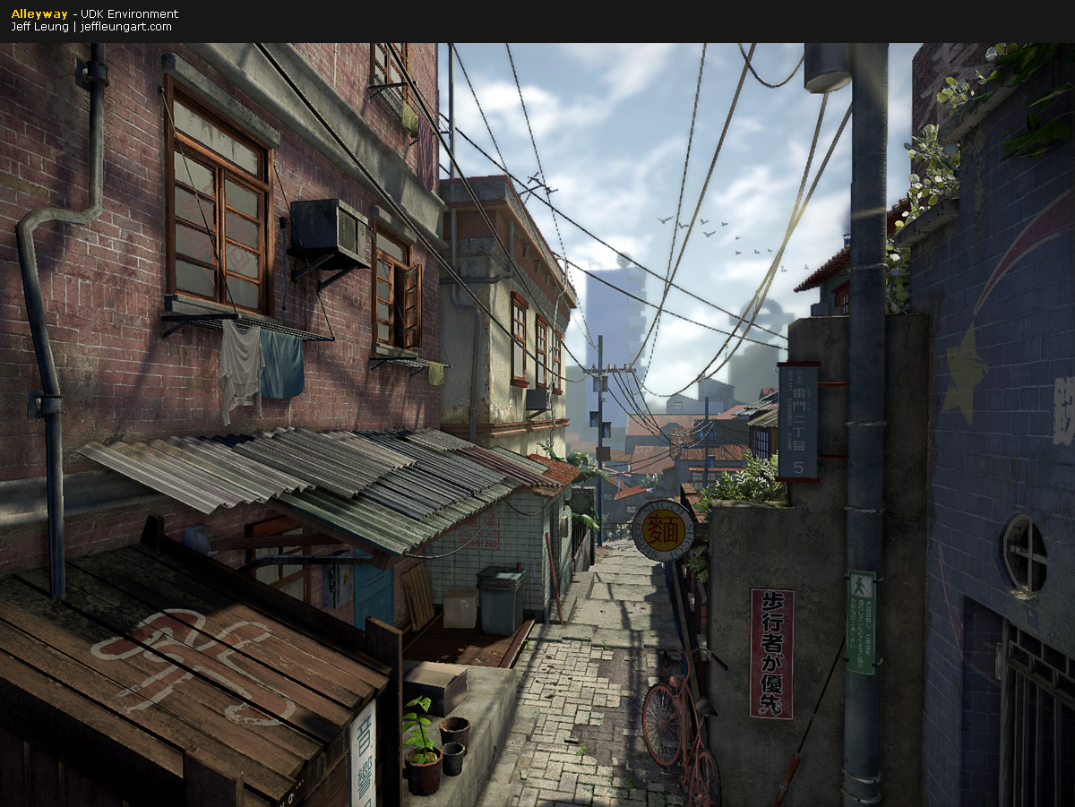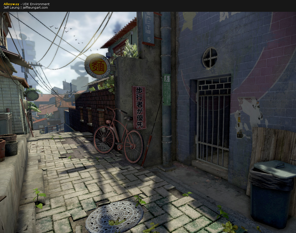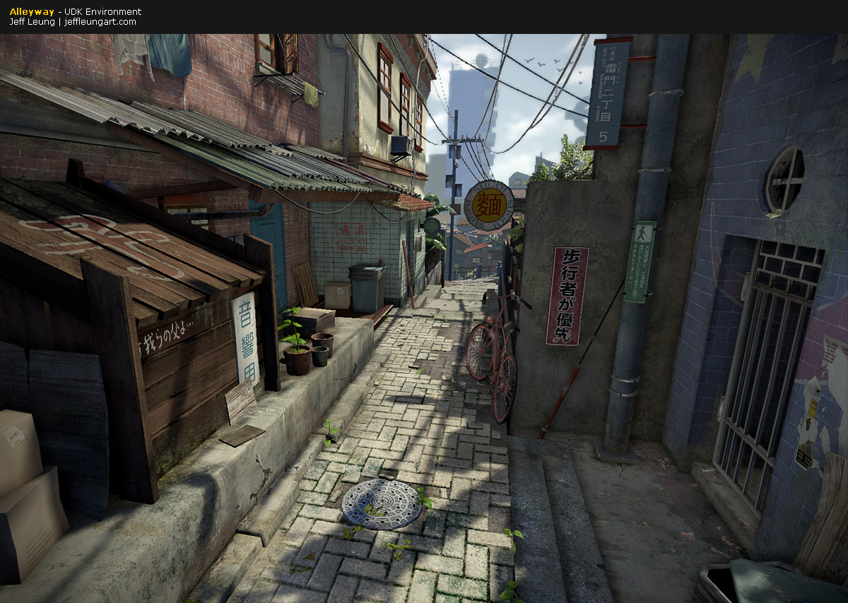 This alleyway scene was inspired by artwork from the anime