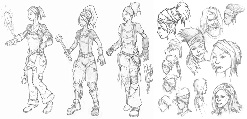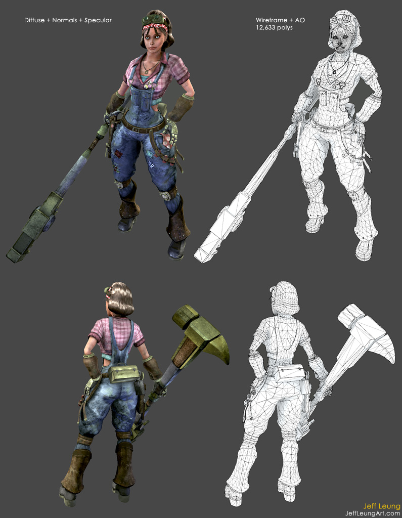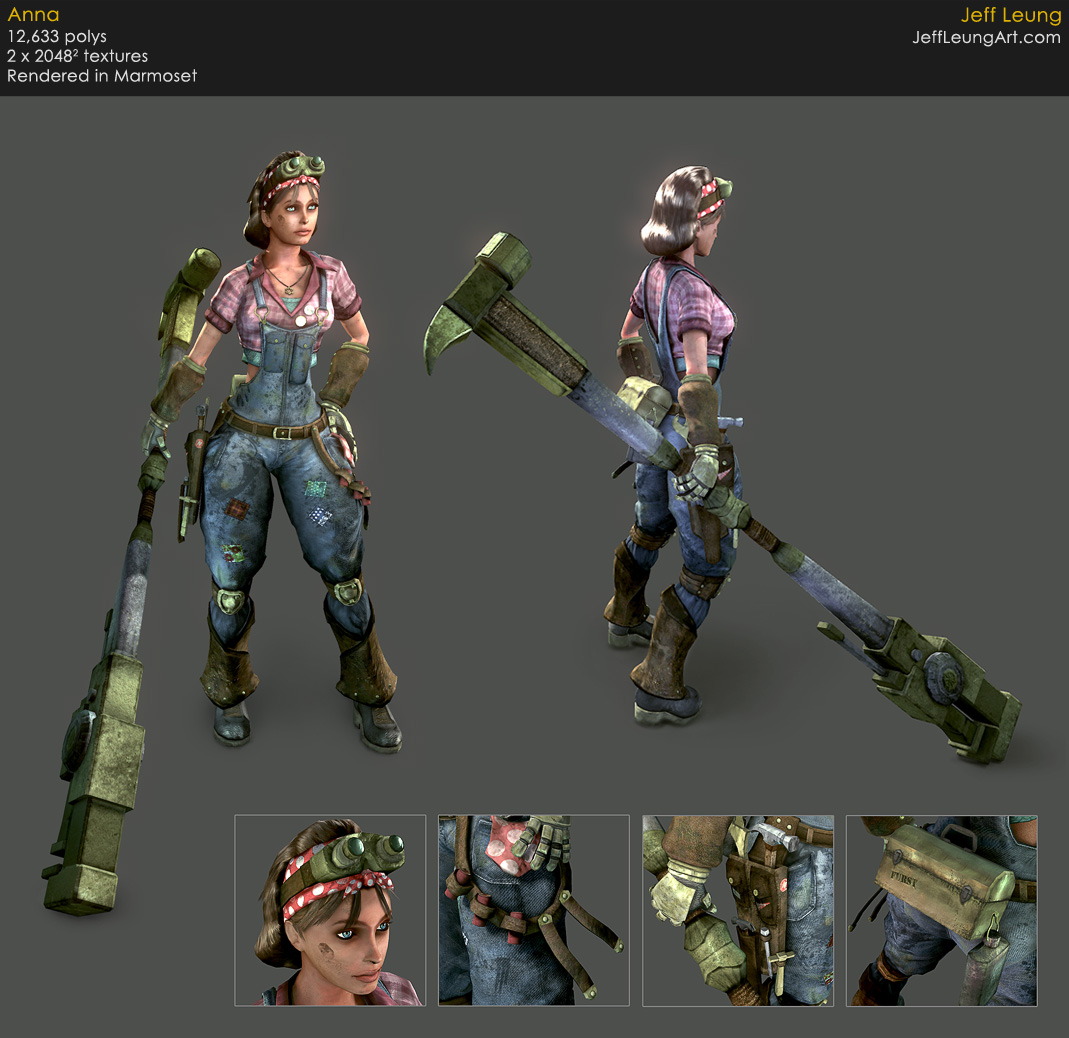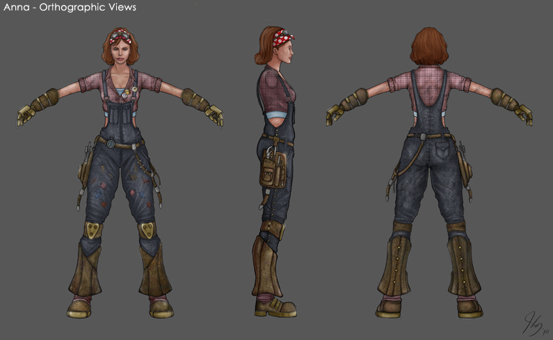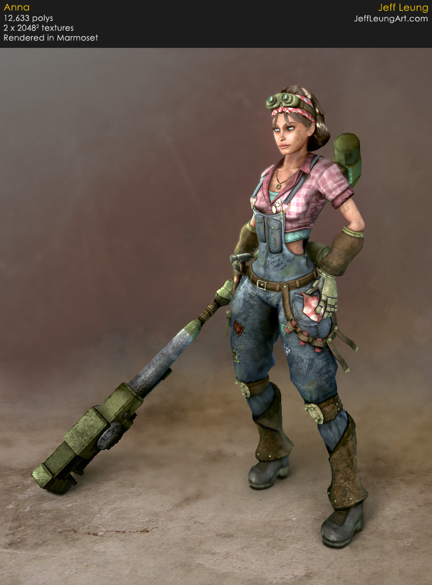 < Back to 3D Art ![]() ![]() 3D Pipeline Meet Anna. She likes gears, grease, and really, really big tools. The inspiration for her came from World War II women who worked in the army factories while their husbands were at war. The "Rosie the Riveter" war icon was also very inspirational. I took that visual aesthetic and spiced it up a bit by adding the oversized hammer/wrench, the toolbelt, the lunchbox, and the war propaganda pins. ![]() ![]() Here are some initial sketches I did: A couple of studies that I did to figure out the hairstyle. The final hairstyle is a combination of the bottom three. ![]() The design that I settled on. A few things changed during modeling and texturing, such as the pants and the toolbelt. ![]() Some of the photo reference I used: < Back to 3D Art |