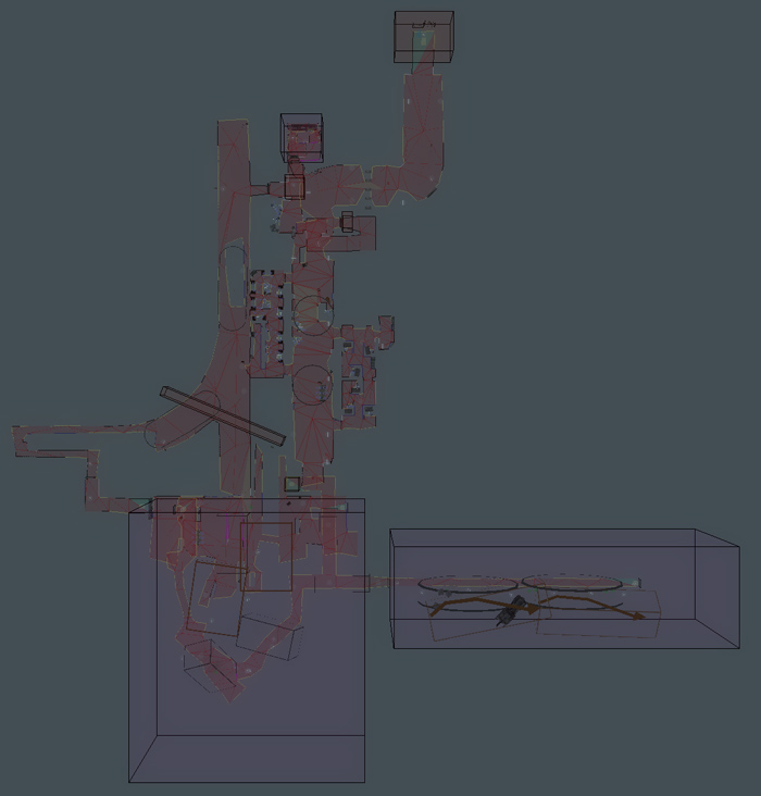 A top-down view of Hyde Park Subway Station in the GECK editor. This shows the navmesh that was created for AI pathing.