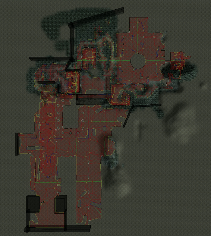 A top-down view of the Junction in the GECK editor. This shows the navmesh that was created for AI pathing, as well as collision boxes to prevent the player from traveling out of the map. The cover provided by various structures (walls, barricades, etc.) was also optimized to get better combat performance out of the AI.
