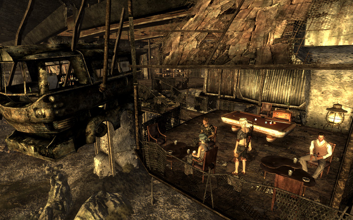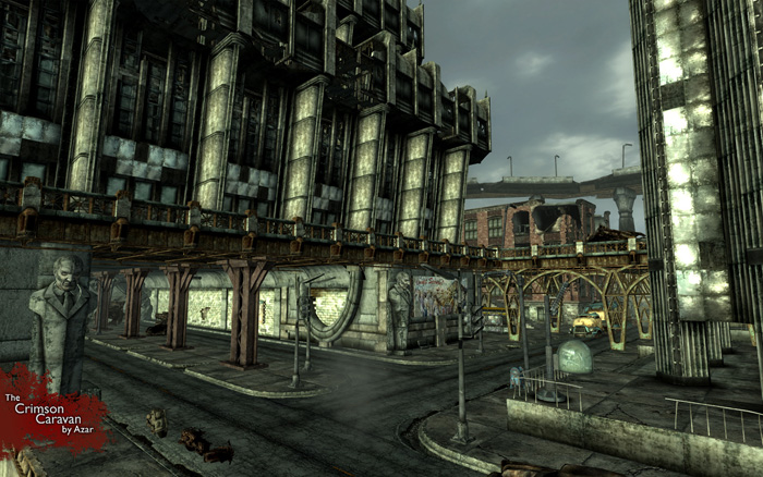 This is the Junction, a new location built for one of the new quests. The Junction is an abandoned city district that is now home to a rogue group of Regulators (lawkeepers of the Wasteland). The player must come here to rescue one of the Crimson Caravan's crewmembers from the Regulators. The player can take one of two approaches. The "peaceful" path consists of two parts; the first involves exploring the Junction to find out clues about it's history. The second involves defending the Junction against supermutants. The "war" path has the player fighting the Regulators. The successful resolution of both paths is the rescue of the Crimson Caravan crewmember.