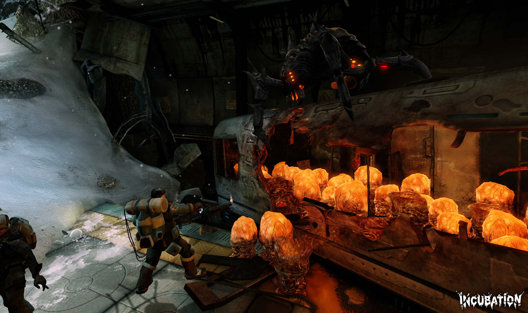 A shot of the heavy soldier threatening the creatures' eggs. The train was a major focal point, so I concentrated on making the shaders as interesting as possible. The eggs have a pulsing emissive texture to give a feeling of life, and there is a heat haze that rises up from them. There is also a caustic light effect running across the train's interior.